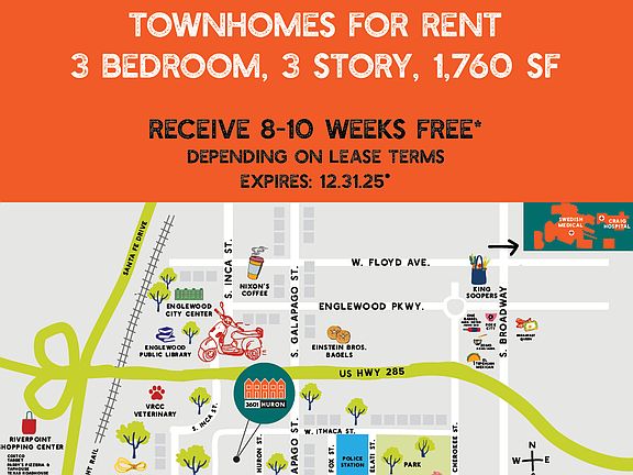 Step into your brand new 3-bedroom 3.5 bath home, conveniently located in the heart of Englewood. Vaulted ceiling creates open living space flow effortlessly between living, dining, kitchen, and patio making the main level perfect for family or entertainment. Thoughtful designs throughout the entire home include large windows with beautiful window coverings and a timeless color package. Enjoy your private 2 car attached garage. Easy access to Hampden, Santa Fe, E-470, Broadway, Downtown Denver and Littleton. Give us a call to hear about our move in specials today.