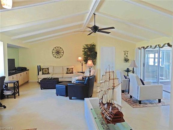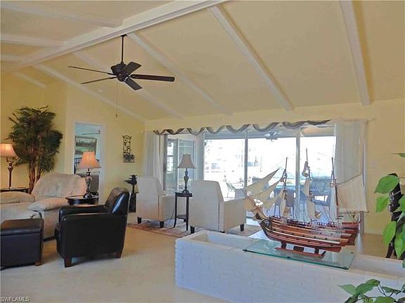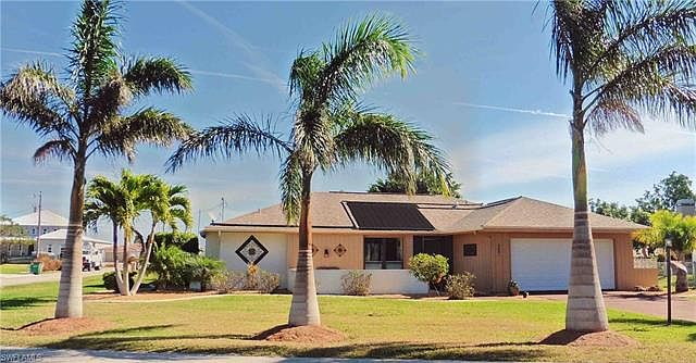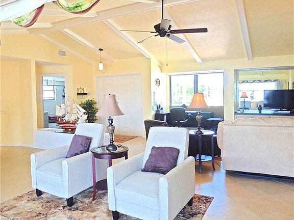 This Beautifully maintained pool home boast pride of ownership throughout. You will be greeted with 3 majestic palms lining this neatly landscaped corner lot which includes a lovely front courtyard style seating area. The double door front entry is screen & once you enter this home you are welcomed with an open bright floor plan with cathedral beamed ceilings, a wall of glass sliding glass doors show off the large under truss lanai with electric storm shutter, pass through bar to the kitchen and welcoming solar heated 8' deep pool. Owners suite features; double sliding glass doors to access the lanai/pool area, double vanity sink, walk-in shower and 2 walk in closets. HVAC was replaced 2014 window blinds are battery operated, pool mechanical's replaced 2104, 2017 hurricane windows and doors installed throughout, microbiological purifying water system, roof replaced in 2007, PVC fence installed 2015. You will appreciate entertaining guest from the well appointed bar with built in hutch. The garage sparkles & even has a side door & window. The furnishings are practically new and negotiable. This Cape Coral gem a must see.