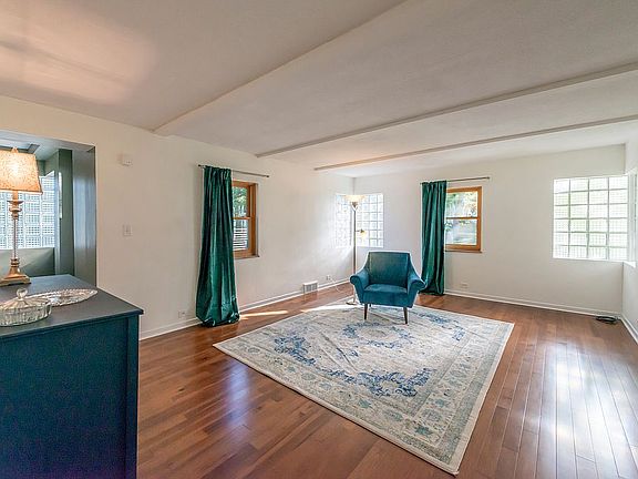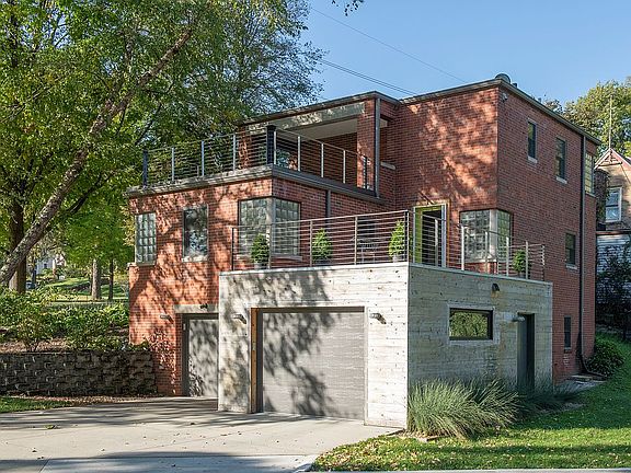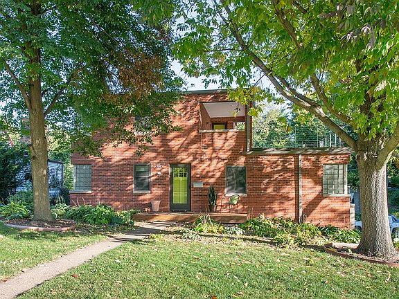 Architecturally unique mid-century modern featuring two rooftop patios with beautiful views of newly redesigned park and pond. Original glass block corner windows sparkle as the morning light awakens the spacious living room and breakfast area. Brand new kitchen features quality cabinets and appliances, quartz counters and floating shelves. There's a great view of the park from the first-floor office/bedroom and the afternoon sun filters in its glass block windows. New hickory hardwood flooring throughout and new carpet. two bedrooms, one with a fantastic closet system with a great spot for a child's bed or a reading nook. You won't mind doing laundry in the laundry area of the new finished basement, which also features new bath with glistening shower. Bonus room in basement for crafts, office, playroom or (very clean) shop. There are his/her tuck-under garages from walk-out basement and a landscaped large corner lot which features a hosta garden, wildflower garden and raised beds for vegetable gardening. This home is solid, energy-efficient and quiet. Freshly painted and squeaky clean, it is move-in ready! Many, many updates to this home over the years have maintained architectural integrity while increasing comfort, style and livability. Updates include (but not limited to): kitchen 2020, new bath 2020, basement finish 2020, furnace 2018, AC 2017, water heater 2016, new garage and patio 2013, roof 2008, sewer line 2007, electric 2008. Windows are unique and not original.