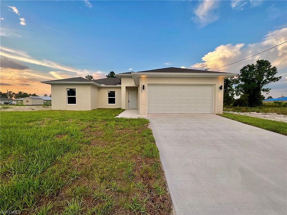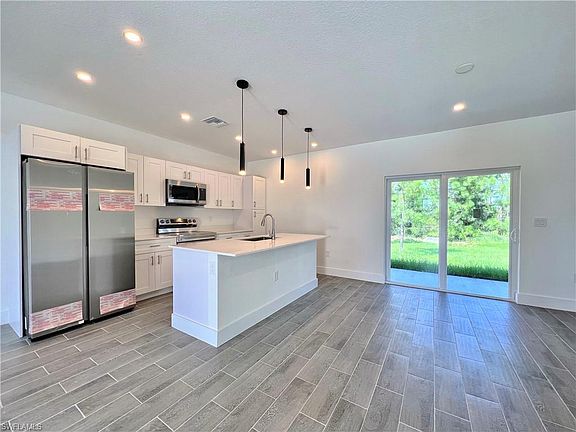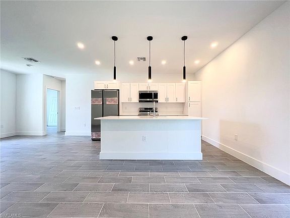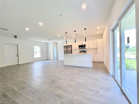 Beautiful brand-new construction, Move in Ready! Enjoy the Florida Lifestyle in this detailed designed home. Home features 3 bedrooms, 2 bathrooms, open floor plan, double car garage, impact windows, lanai, and a large 16 ft concrete driveway. The open floor plan encompasses a spacious living area, deluxe kitchen island, and dining room: Making it a perfect home for entertainment! Master bedroom has two huge walk-in closets and the bathroom includes dual vanities and a walk-in shower. Stainless steel appliances, white quartz countertops, soft close shaker cabinets, luxury vinyl, 5 inch baseboards, and energy efficient LED lighting is found all throughout. Conveniently located near SWFL International airport, FGCU, shopping centers, and Top Golf, this home offers effortless access to the best of Southwest Florida. State Road 82 is just south of this location, providing swift access to Interstate 75.