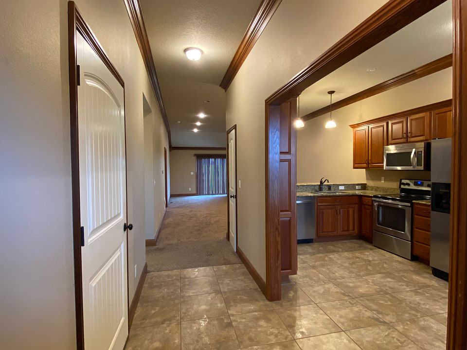 Large 2 bed, 2 bath, 2 car garage duplex w/open concept design, high ceilings, double crown, stainless and stainless appliances. Close to lots of restraunts and a short drive to KCMU medical school and Missouri Southern State University -We do not allow pets nor smoking of any kind. -This unit has a very open concept living/kitchen/dining area featuring dark stained custom kitchen cabinetry w/granite counters. -2 good sized bedrooms. -Utility closet w/hook-ups for washer and dryer. -Lots of tile floor. -All electric. (Central AC/Heat via heat-pump system which is very efficient) -Lessee/Renter is responsible for all utilities and electives (such as cable or internet, if desired) -We provide the lawn service -One year lease is required. First month rent can be pro-rated. -If you are interested in applying or viewing a unit please call/text Four1seven 8FiveZero Twelve21. -Rental applications can be picked up at our office Monday-Friday 8am-5pm at 2024 E. 32nd St. Joplin MO, 64804 We do charge a $20 application fee.