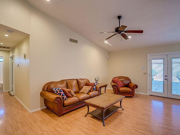 Large corner lot.This single-level 3-bedroom home features a covered pavers patio, private pool & spa, plus access to a community pool! Large kitchen, breakfast bar, & pantry. Gather in the living room around the central fireplace. Master suite has a walk-in closet, dual sinks, & vaulted ceilings w/vaulted ceilings extending throughout the common areas! Newer upgraded landscaping and exterior lighting. Includes Fridge, washer and dryer.Home has been well maintained.. Perks include a 2-car garage & close proximity to shopping/dining options, supermarket, theater, I-10 access, parks, & trails at Wonder Rift! Wonderful Family home!