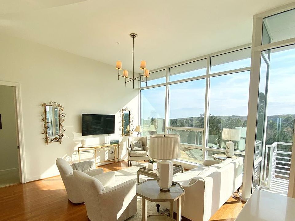 Top floor FULLY FURNISHED luxury condo with tasteful upscale decor, linens, and fully equipped kitchen. High end finishes include granite countertops, stainless steel appliances, hardwood floors and floor to ceiling windows with incredible views of Finley Golf Course. UTILITIES INCLUDED. A king-size bed with premium linens, ensuite with double vanity and walk-in shower make the primary bedroom a welcome retreat. The second bedroom offers queen size bed with convenient access to secondary bath complete with tub/shower combo. Residents have access to the rooftop pool and state-of-the-art workout facilities. Also included are two dedicated parking spaces in gated underground lot. Location provides easy access to UNC-Chapel Hill, Research Triangle Park and RDU Airport. Just steps away you will also find shopping and amazing restaurants including Elements and Hawthorne & Wood. No smoking and no pets please. Lease term flexible - minimum term of 6 months.