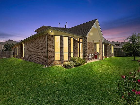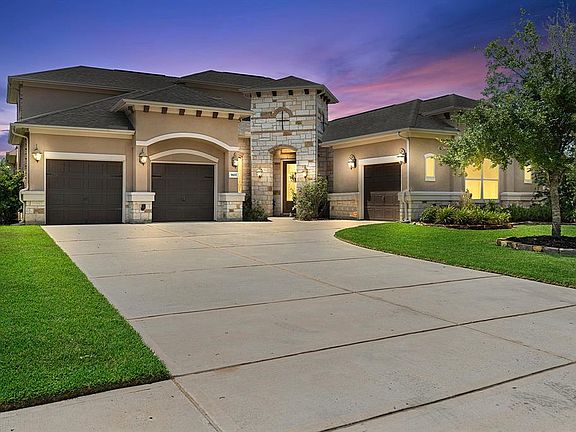 This stunning Village Builders "Brigsby" from their Kingston Collection is a timeless beauty w/great function & flow. Rare 1.5 story on corner lot backs to a greenbelt so no back neighbors w/ a 24 hour guard gated access. Special features: true 3 car garage, hardwoods, tall, tray ceilings w/double/triple crown molding, designer light fixtures, study with glass French doors & coffered ceilings, wine grotto w/fridge, huge chef's kitchen w/double ovens, tiered cabinets w/glass fronts, under cabinet lighting + butler's pantry & breakfast area, huge master bedroom with separate sitting area, luxurious master bath ensuite has dual sinks, oval tub with therapeutic jets & separate frameless glass shower, great storage, walk in closets, & wifi thermostats. Game room, media room & 1/2 bath up. Appliances stay! Walking distance to pool, park, splash pad, walking trails, tennis, basketball. A+ rated schools, Grand Oaks. LOT WILL ACCOMMODATE A POOL. MAKE SURE TO VIEW THE POOLS PHOTOS & POOL VIDEO!