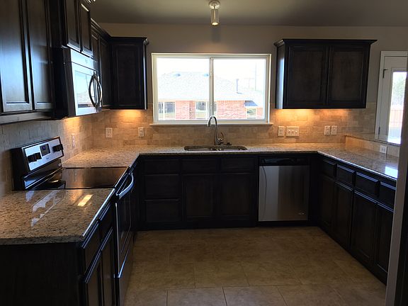 This beautiful 4 bedroom 2 bath house welcomes you great curb appeal. Inside you will find this split floorplan perfect for relaxation as well as entertaining. The kitchen comes complete with granite countertops, under cabinet lighting, stainless steel appliances, built in microwave and an eat at bar with pendulum lighting. The cozy living room is perfect for relaxing in front of the beautiful gas fireplace. The Master bath offers an oasis with its garden tub, separate shower, dual vanity sink and large walk in closet. This floorplan gives you the options you need with being able to convert the fourth bedroom into a study for more space if needed. Home includes landscaping, full fence, alarm, fire resistant sheet rock, tornado safety features & tons of energy efficiency savings!