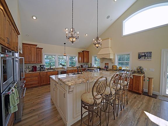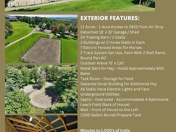 This home has a million dollar view of Seneca Lake and its surroundings with windows galore. There are 2 bedrooms on the main two floors and open studded room in the basement to create one or two more bedrooms. Vaulted ceilings, custom walnut kitchen cabinetry with huge island, stone fireplace, radiant heat, massive second floor bedroom, LL family room. Lg laundry room w/oak cabinets-island. LL Bathroom studded w/ shower installed. 9 horse stalls, 7 pastures, horse tracking system, outdoor arena, round pen. 1 acre on the 2400 ft. airstrip. Hot tub negotiable. House plumbed for A/C. No DRIVE BYS please. This is a private community.