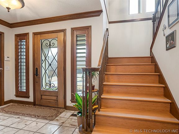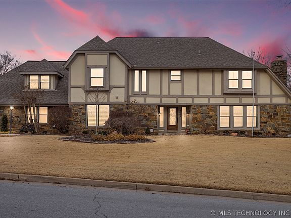 Magnificent & impeccably maintained Tudor style home on 1/2 acre lot in Jenks! Large-scale rooms, flexible living spaces, remodeled granite eat-in kitchen w/island, morning/living room open to kitchen & family room w/FP, private study w/built-in desk & bookcases, master BR (up) w/fully renovated bath w/heated floors & private balcony, 3 BR's, full bath & game room up. Park like backyard w/heated, salt water pool, deck & pergola. Sprinkler system. Walking distance to Jenks East Elementary. Truly a must see