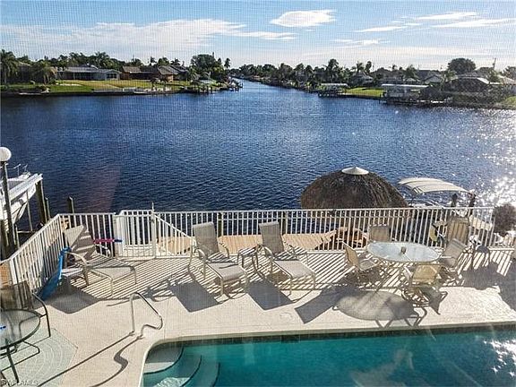 Immaculate 3 bedroom/2 bathroom condo on intersecting canals giving the owner beautiful SW Florida sunrises. Home comes turnkey/fully furnished, ready to move in. Master bathroom with dual sinks and separate tub/shower. Carpeted bedrooms. Floor tiled bathrooms, kitchen, hallways and dining area. Wood flooring in living room. Stacked washer/dryer in hallway closet. Electrically heated pool. Deeded boat dock with 8000# lift which can be leased out if buyer is not a boat owner. Boat lift has recently been upgraded with new electronics. 15 minute boat trip to river passing under 1 bridge. Complex is built with 3 separate buildings/2 units each, so no common walls are shared to increase privacy and also constructed with concrete floors to reduce sound transfer. New water heater 6 years ago. In home pre-wired security system. 100 mph rated sliding glass doors on lanai for storm security. If buyer is purchasing as a rental investment, seller may be willing to rent back unit from January to March.
