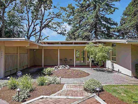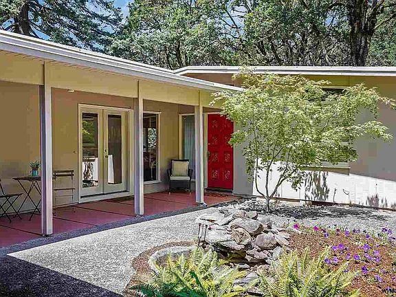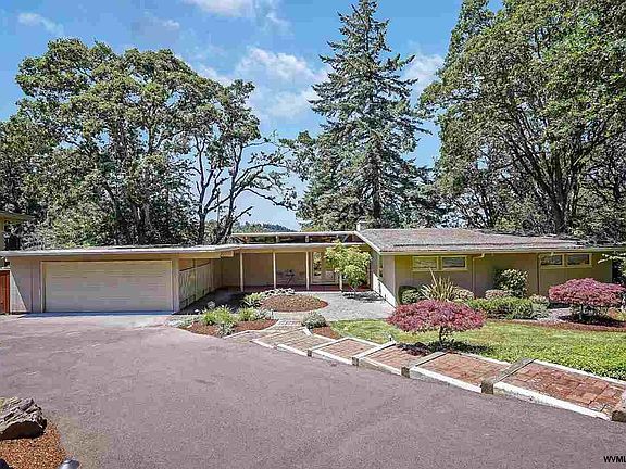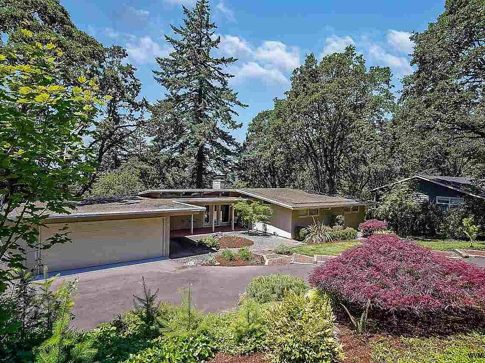 Classic mid century modern, designed by Phil Settecase. Beautiful open beam ceiling, newly finished oak hardwood floors. Huge 2 sided fireplace with stunning copper hood. Main and bed #2 on main level. Watch fabulous sunsets thru large expanses of glass. Daylight basement with big family room, fireplace built in bookcases. Spacious bed #3. Superb South location. A true gem!