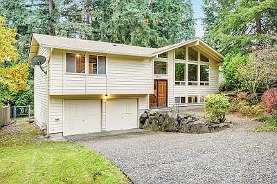 Beautiful Northwest split-level home on large, wooded lot. Vaulted ceilings in living/dining great rm; French drs lead to spacious deck; hardwoods thru main flr; large kitchen w/gas stove, pantry & tons of cabinets; master suite & 2 BRs up; newly renovated main bathroom plus 1/2 bath down; fam. rm w/wood fp plus 4th BR down; fresh paint in and out; new high eff. gas furnace; newer gas water htr, giant 2-car garage; beautiful neighborhood close to highways, transit, shopping, parks and schools.