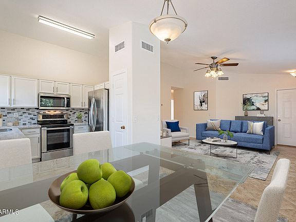 This is the one! Located in Glendale's North Canyon Ranch, this is the home you have been looking for! Soaring vaulted ceilings invite you into the home. Once inside, you will find a spacious living room at the center of the floor plan. The kitchen has been updated with granite countertops, stainless appliances, custom backsplash, & an under mount sink. The primary bedroom connects perfectly to the ensuite bathroom and walk in closet. Down the hall, 2 additional bedrooms. Outside, relax under the covered patio and watch the Arizona sunset! Low maintenance yard! Additional features include: new paint, updated windows and a newer HVAC unit! Take a tour and see for yourself!