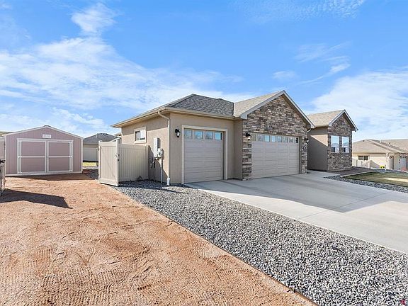 Discover this impeccably maintained ranch-style home, crafted by JB Homes (Byler Construction) and nestled on Montrose's south side. Enjoy proximity to the Montrose Recreation Center, shopping, dining, and Cottonwood Elementary School. The thoughtfully designed split-floor plan features a spacious living room with a corner gas fireplace, ceiling fan, and sliding doors off the dining area to a back patio. Bright and open kitchen boasts a peninsula with room for barstools, pantry cabinet, granite countertops, and a casual dining area. A range/oven, refrigerator, dishwasher, and microwave are included. Durable laminate wood flooring spans the dining area, kitchen, casual dining and hallways, while a carpeted living room and bedrooms offer comfort. The master en suite includes a large linen closet, an easy step-in tiled shower, and a generous walk-in closet. Ceiling fans in each bedroom. Additional conveniences include a laundry room with a utility sink, extra cabinets, and a pocket door. Experience efficient natural gas forced-air heating and central air conditioning, along with high-speed Elevate Fiber internet connectivity. The attached three-car garage with hanging storage rack included provides ample space. Outdoor features include an expansive covered back patio, low-maintenance landscaping with sprinkler and drip systems, concrete curbing, raised garden beds, and vinyl privacy fencing. A sizable shed, insulated with finished walls, electricity and a mini-split for heating and cooling, and a double gate on the home's side enhance functionality. This move-in-ready gem awaits you…make this wonderful home your next home!
