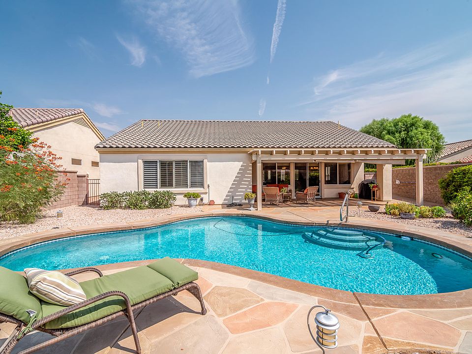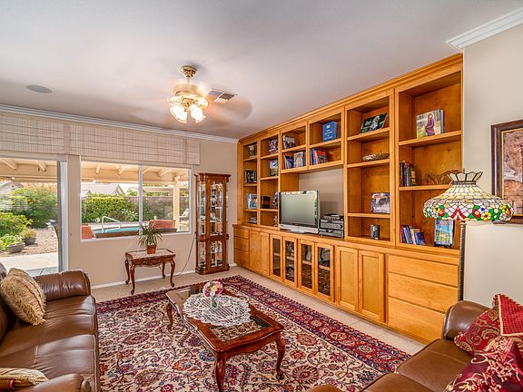 Price reduced! Don't miss this beautiful and very popular St Croix with its own private freeform pool, on an oversized and lovely landscape lot, a rare find at Sun City. The expanded patio w/Alumawood cover makes outdoor living and entertaining ideal at this fine home with lots of privacy. Features include a Greatroom w/custom ceiling surround Sound System, a 14 ft length custom built-in entertainment center with plenty of book shelve space, quality Berber rugs, Large Master Suite with sitting area and Large walk-in closet, 2 baths, den/ hobbyroom or office, a very open Cooks kitchen with high end granite counters and tile backsplash, with Island, breakfast counter, pull out drawers and large breakfast room, beautiful custom window coverings ,maple cabinets, ceiling fans in all rooms, wainscoting treatment in nook & dining area, elegant Crown molding throughout every room, mirrored closets in both bedrooms, tile flooring, 2 car epoxy floor garage + golf cart & storage cabinets. This home provides all the high quality features that perfectly complement the first class features Sun City offers a 24 hr guard roving patrol, 25 lakes, 2 18 hole golf courses with practice facility, a softball field, fishing lake, 20 tennis and 8 bocce courts, miles of jogging, walking and biking paths, 3 clubhouses with restaurants, theaters, fitness centers, a ballroom as so much more for wonderful social opportunities.