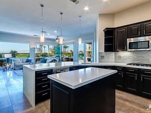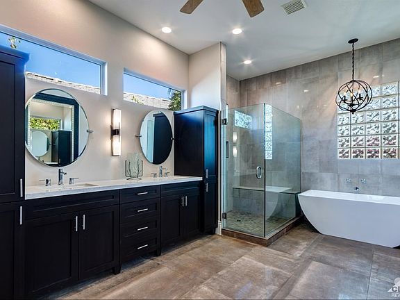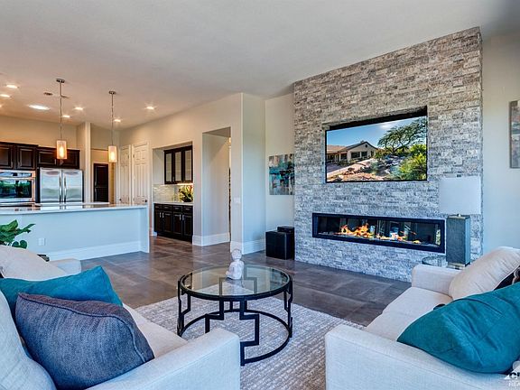 Sun City Palm Desert - Be the lucky person to find a TOTALLY REMODELED contemporary 3 bedroom 4 bath home with a FABULOUS view in wonderful Del Webb Sun City!! Everything has been changed in this lovely open floor plan! Some of the items include: porcelain 2x4 porcelain tile throughout, new LED lighting, fabulous gourmet kitchen including expresso cabinets, KitchenAide stainless steel appliances and beautiful quartz countertops with glass backsplash, custom built in stone electric fireplace wall with BRAND NEW Samsung UHD TV , fantastic master bath with deep soaking tub, shower with bench and glass enclosure, dual vanity with pull out storage, and a drop dead custom mirrored barn door that leads to a tremendous closet, all baths have been remodeled. Nothing has been forgotten in this transformation Exterior boasts a fabulous patio facing San Yasinto with beautiful sunsets, includes a gorgeous double waterfall, retractable patio cover, built in BBQ. Out of space so come and see