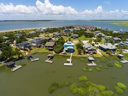 Enjoy the BEST of coastal living in this custom 5-bedroom, 3 bath designer furnished home with 10 x 25 floating dock and 14.4 x 14.4 pierhead. The property even has room for a pool! Short 4-minute walk to the Sound Beach for sunning, swimming, shell collecting, relaxing, and enjoying stellar sunsets. Your family will love fishing, shrimping, crabbing, watching shore birds and relaxing on your private dock. Entertain friends and family by the water with plenty of outdoor living including sundeck, screened porch and ground level cookout area! Recent upgrades include HVAC units, hurricane windows, sliding doors, metal roof, exterior and interior paint, aluminum Dock Ramp, deck and walkway to dock, new appliances, quartz countertops, tile, and updated coastal decor.You can easily cruise in your kayak, paddleboard, jet ski, or small boat from your home with your tidal creek dock to Big Bay Creek to enjoy dining on the creek, sunsets, porpoise watching, tubing, and more. Custom features of home include large screen porch with cozy children's enclosed playhouse, spacious sundeck with access to ground level, hardwood flooring, luxury vinyl plank throughout, fireplace in great room, dual master suites, one with private balcony, laundry room, & third floor loft perfect for libations with panoramic views of creeks and sunsets. Ground level includes 2 outdoor showers (1 enclosed), spacious entertaining area, parking, and large storage room. Don't miss this one.