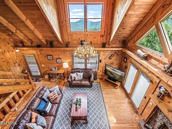 Welcome to your luxury mountain retreat in the highly sought-after Wears Valley—the quieter side of the Smokies. This beautifully appointed 5-bedroom (on 3 bedroom septic), 3-bath cabin spans approximately 2,700 square feet and comfortably accommodates up to 12 guests. Thoughtfully designed with comfort and elegance in mind, the cabin features vaulted ceilings in both the living room and primary suite, creating an airy, open atmosphere. The main level includes two well-appointed bedrooms, while the upper level showcases a spacious primary suite with a king bed, vaulted ceilings, an en-suite bathroom, and a 70-inch Smart TV. A dedicated kids' room with bunk beds and a private lower-level queen suite offer privacy and flexibility for larger groups.
