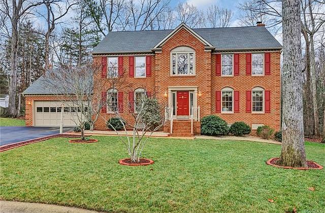 Gorgeous brick front Colonial on 2/3 acre lot in Milhaven! 2-story foyer and hardwood floors throughout first floor. Formal living and dining rooms. Large and open kitchen with granite countertops, beautiful tile backsplash, stainless steel appliances, and breakfast area with bay window overlooking backyard. Great family room with fireplace and dry bar. Huge glass enclosed Florida room with vaulted ceiling, skylights, and ceiling fan opens onto modern deck with glass walls to enjoy the amazing back yard and stamped patio. Great master bedroom suite with vaulted ceiling, his and hers walk-in closets, and en-suite master bathroom with skylight, separate shower and Jacuzzi tub. 12X10 rear composite deck and large stamped patio for entertaining over looks the wooded back yard with trails to stream and nature walk. Very rare lot for this part of town and school system. Richmond's top schools are just another added bonus here. Plus detached storage shed for additional storage and attached 2 car garage with paved driveway. Hurry so you don't miss this one!