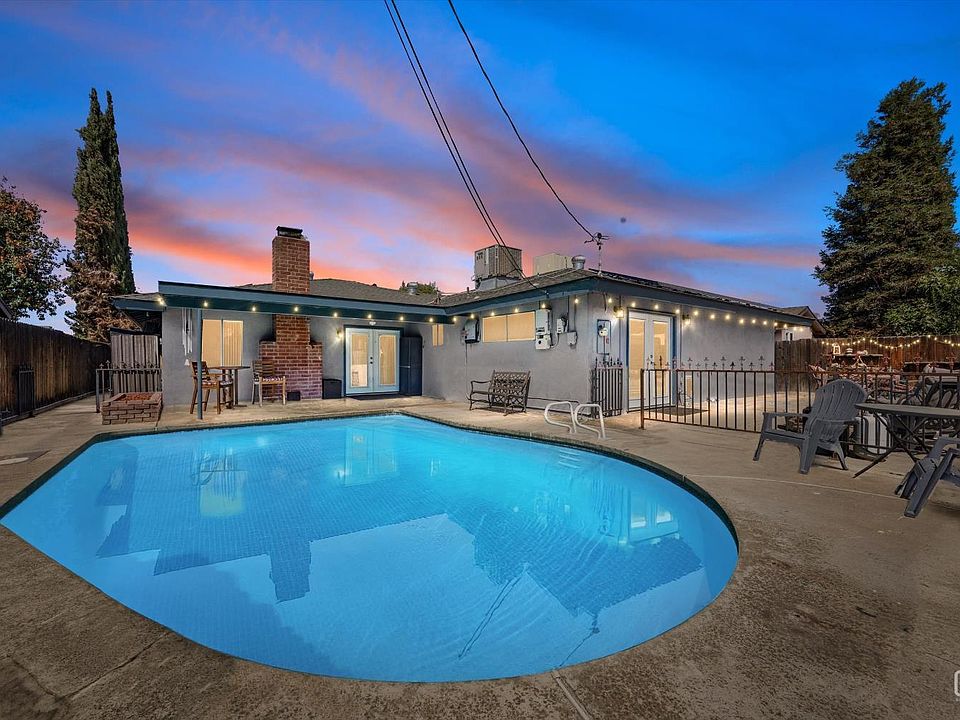 Refreshing poolOutdoor fireplaceString lightsCustom tileNew patio roofNew quartz counterRemodeled bathrooms