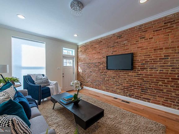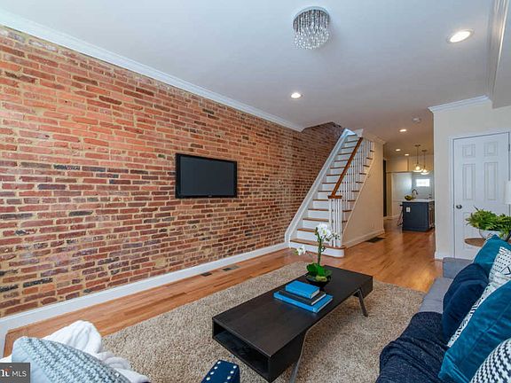 Totally Rehabbed Canton Townhouse with exposed brick wall, hardwood floors on main & upper level, All systems new: Electric, Plumbing, Windows. Large Picture Window in Living Room. Custom Gourmet kitchen with marble counters & backsplash, White Cabinets with Navy Island Breakfast Bar, Stainless Steel Appliances, + bonus room behind kitchen. Owners Suite with Full bath with glass tiles, 2 upgraded full baths on upper level and 1 half bath on the main. Finished room in basement with carpet and walk up to backyard with paved parking.