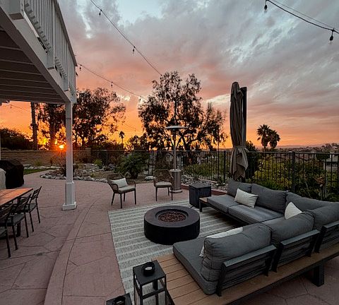 Perched on an expansive elevated lot with sprawling views and a peek-a-boo ocean view, the home invites you to enjoy golden sunsets and ocean breezes from your beautifully furnished patio, complete with comfortable lounge seating and a large outdoor dining table perfect for entertaining.