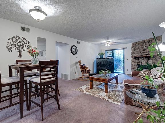 First floor condo with walk-out patio to the community tennis courts and greenbelt won't last long! The open floor plan boasts a dining area that flows into the spacious family room with wood burning fireplace with stone surround, as well as into the kitchen featuring an abundance of oak cabinets, pantry, and granite countertops. The master bedroom with walk-in closet and secondary bedroom are both spacious and share a full bathroom with large vanity. One large garage space and one reserved parking space included in front of the unit with lots of visitor parking very close for extra convenience. The Tall Pines community offers beautifully landscaped common areas including walking paths, park, tennis court, clubhouse and outdoor pool. Just minutes to Bear Creek Park & Trail, Pinecrest Village Park, Pinehurst Country Club, shopping and restaurants.