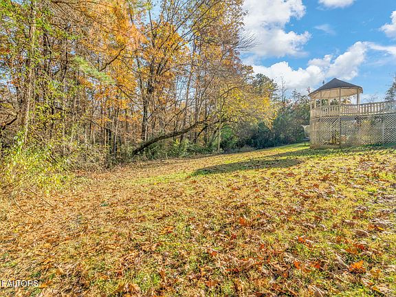 The home features four bedrooms and three full bathrooms, with two bedrooms located on the main level and two upstairs. The open floor plan includes an oversized living room with another sitting area that has a brick wood burning fireplace and a built in bar that will convey. The foyer offers vaulted ceilings for a welcoming entry. The kitchen has been updated with stainless steel appliances for a modern touch. A matching gazebo outside creates a perfect place to relax and enjoy the outdoor setting, especially during the vibrant fall season when the mature trees are full of color.
