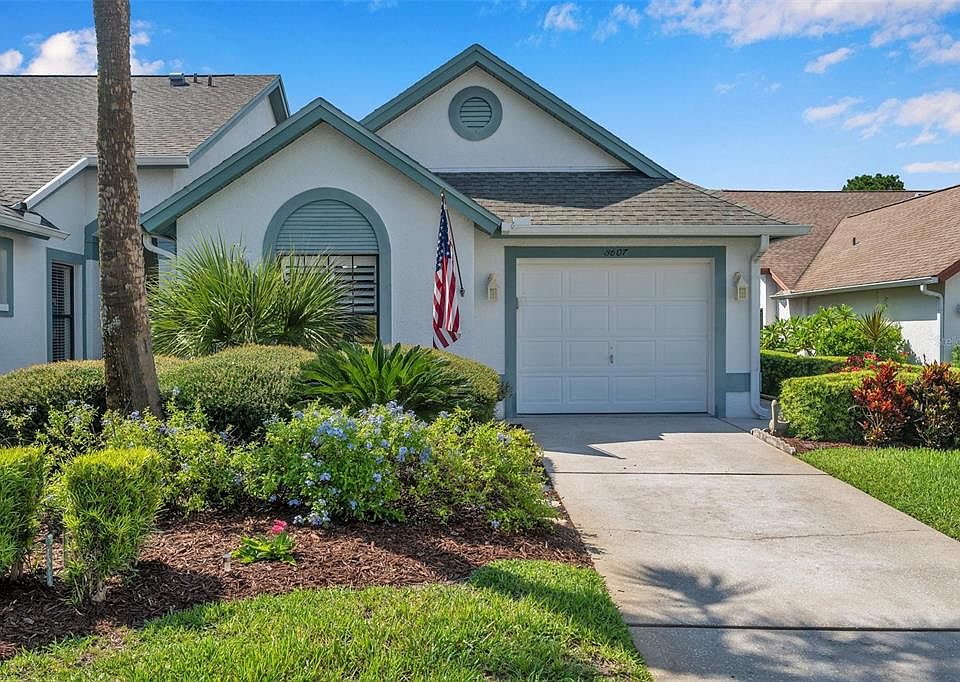 Now accepting conventional financing! Welcome to 3607 Downfield Pl, an exceptional residence nestled in the vibrant community of Seven Springs Golf & Country Club. This 2-bedroom, 2-bathroom villa, complemented by a 1-car garage, represents a rare opportunity to immerse yourself in a lifestyle of comfort, luxury, and charm. Here, each new day begins like a serene symphony, set against the breathtaking backdrop of the 12th hole green and fairway. Imagine sipping your morning coffee on the back patio as a warm Florida sunrise illuminates the meticulously maintained golf course. The distant sound of a perfectly struck golf ball breaks the calm of the morning, a delightful reminder of the unique lifestyle this home offers. This isn't merely an occasional pleasure but a daily privilege bestowed by this home. The generous 1553 SqFt layout is designed with a harmonious blend of modern elegance and practical living space. At the heart of this home, the kitchen shines with its gleaming granite countertops and stainless steel appliances. An adjacent formal dining room sets the stage for memorable meals and grand celebrations. The interior showcases cathedral ceilings that enhance the feeling of spaciousness, and vinyl laminate flooring adds a touch of sophistication. Custom shutters grace the windows, creating a dance of light and shadow that brings every room to life. The spacious bedrooms are havens of tranquility, with the master bedroom boasting a generous walk-in closet. The bathrooms continue the theme of luxury with their elegant granite finishes. The villa also includes a washer and dryer conveniently located within the home itself for ease and efficiency. For your comfort, the home features a 3.5-ton Trane HVAC system, equipped with a new air handler and a UV Light system for the ducts. The system maintains a perfect indoor climate throughout the year, providing you with peace and comfort in every season. A new water heater was installed in 2023. The air-conditioned Florida room extends the living space and provides a perfect setting for relaxation or casual get-togethers. Tinted windows allow you to enjoy the stunning golf course view from the comfort of your home. This dream residence comes with added perks and its fees cover comprehensive services such as lawn maintenance, roof repair (with a new roof planned for next spring), painting, cable, water, internet, access to the vibrant Seven Springs Golf and Country Club and more. This home extends beyond its walls, inviting you into a welcoming community that is perfect for families of all ages. Contrary to common assumption, this isn't a 55+ community but a vibrant, welcoming place for everyone, where neighbors become friends and every day feels like a vacation. Embrace this vibrant lifestyle at 3607 Downfield Pl. Make the first step towards this exciting journey by contacting us today for a private tour. Given its unique features and location, this home won't stay on the market for long. Your dream home awaits. Don't just dream about this lifestyle, live it at 3607 Downfield Pl.