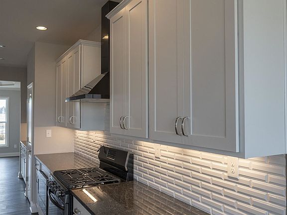 The Hartford II features entry windows, transoms and sidelights around the front door, and a detailed garage exterior with dual doors. One of the largest first-floor bedroom homes offered, the Hartford II has formal living and dining, plus a large two-story family room with abundant windows and optional built-in bookcases and fireplace with a two-story stone to ceiling. The kitchen includes an island with breakfast counter and adjoins the dining room via a hallway with a built-in butler's pantry. Kitchen also opens to the breakfast area with modified bay window and boasts variable height, white cabinets, granite countertops and black stainless appliances including gas range, chimney hood, built-in microwave and French door refrigerator. A luxurious primary suite is located on the first