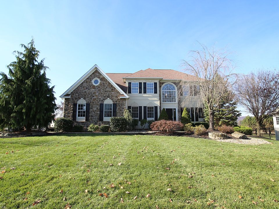 This exceptional 4-BR (opt. 5th), 3.5-BA home is located just minutes from the Promenade Shops, Saucon Valley CC, Wedgewood Golf Course and within the state-ranked SLH school district. A spacious & open floor plan offers exceptional flow, sophisticated entertaining space, as well as intimate family living. The updated kitchen includes a gas cooktop, stainless-steel appliances, hardwood flooring, granite counters, and breakfast island. Just off the kitchen, the sunken great room’s 2-sided, stacked-stone fireplace is a dramatic, first-level focal point that stretches 16’ to the vaulted ceiling and is a show case feature of this stunning home. The sun room boasts a second fireplace and its wrap-around windows provide glorious sunset and mountain views. The interior of this home is stylishly appointed throughout with high end amenities including a 2-story foyer, crown molding, wood flooring, and freshly painted interiors and exterior. The sprawling master suite includes a sitting area and ensuite bath with a column-flanked soaking tub, essential white tile, and separated double sinks. A walk-in closet completes the retreat. 3 additional upstairs BRs are spacious, sunlit & benefit from beautiful framed views. A huge, finished walkout LL with 9’ ceilings features a kitchen/wet-bar with granite counters, full custom bath w/walk-in-shower, and a large fitness room (or optional 5th bedroom) - perfect for an In-Law suite! The basement also includes an abundance of professionally built storage and is prefabbed for a 3rd fireplace, completing this perfect entertainment escape. The entertaining continues on the ground-level outdoor patio and second-level Trex deck, (which sports a kid friendly fire pole!) and access to the expansive backyard. This move-in condition home is conveniently located within 10 mins of Routes 309, 78, and 476 and is waiting for its new owners!