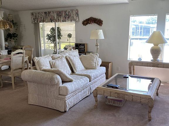 If you are looking to move into a 55+ community that has a lot of activities going on all the time, then you do not want to miss seeing this beautiful home that sits on a corner lot. This is a 3-bedroom split plan with two baths. All bedrooms are with walk-in closets with large baths. This home has a lot of storage shelves in the laundry room along with extra room for your brooms and vacuum. The kitchen is big with an island in the center and an office desk on the side of the kitchen. The living room and dining room is huge with a bar facing the kitchen. The home is 1596 square feet with a long driveway. The roof was replaced in 2014, the air conditioner in 2019, and the water heater in 2012. This home is coming mostly furnished with nice furniture. Lanai is large with vinyl windows that set on the corner of the house so you can see out to both sides. The shed and carport were redone in 2017. Lot rent on this home is $540.00 per month and includes mowing, edging, and security gate in front and back of the community. This community allows two dogs under 25 and inside cats. All listing information is deemed reliable but not guaranteed and should be independently verified through personal inspection by appropriate professionals. Integrity Mobile Home Sales cannot guarantee or warrant the accuracy of this information, measurements, or condition of any property. Measurements are approximate. Lot rent is subject to change.