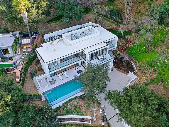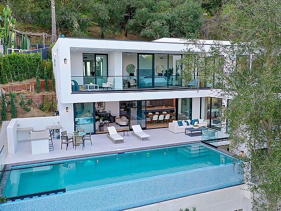 This modern showplace has been designed on a grand scale for exceptional entertaining and luxury living. Built on half an acre, it is a premier view property that will captivate even the most discerning buyers. The intelligent design of this home features an open-concept layout that provides light-filled, spacious living areas with spectacular wrap around walls of glass. Over 1,200 SF of patio space and generous pool area provide this celebrity-worthy home with sweeping views & create awe inspiring flow of indoor/outdoor living. Set high above the street, this home delivers show-stopping curb appeal while at the same time offering a distinct sense of privacy. This stunning Hollywood Hills home represents the ideal balance of all lifestyle elements! The main level features an exquisite open kitchen w/ high-end appliances, hand-built, custom Italian cabinetry & oversized Calcutta marble waterfall island which provide unparalleled space for cooking, dining & socializing. The kitchen opens seamlessly into expansive dining, family & living areas, one of which is equipped w/ a surround sound home projection system. All five bedrooms are ensuite, w/ large master bedrooms & spa baths. With high-end finishes & fixtures throughout, including wide plank oak flooring as well as state of the art smart home upgrades, this home is a must see!