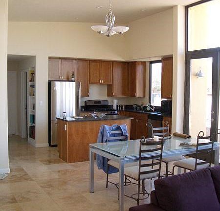 Innovative contemporary design includes 14 ft wall of windows, cozy patio w/ fireplace. 13' high ceilings- concrete floors. Open Great room.
