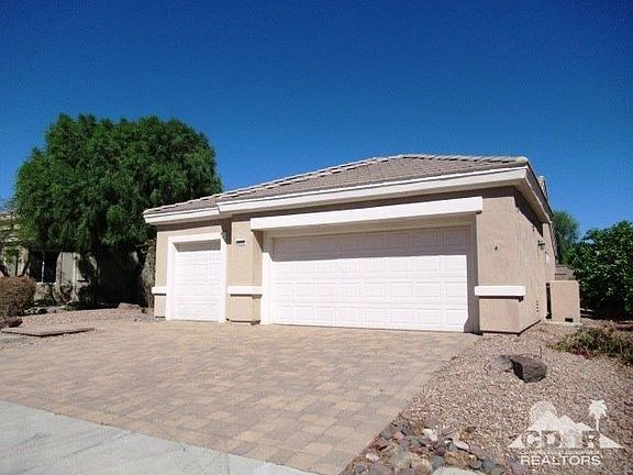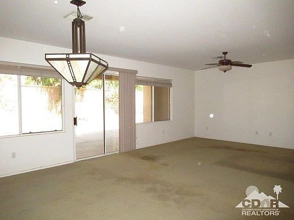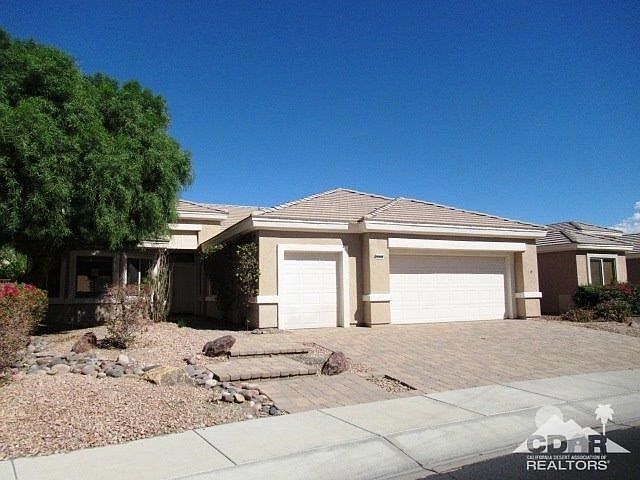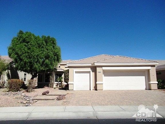 Lovely HUD property in Sun City Palm Desert! St. Croix model with great curb appeal with custom finished paver-laid driveway and entry, two car with golf cart garage. Many upgrades include tile flooring with decorative entry accent, quartz kitchen counters and breakfast area. Master BR has two closets, one of them with a walk-in off the master bath with built-in storage/organizer. The second guest bedroom with a nearby bath and office with built-in desk and library shelves and additional den/ hobby room. Spacious rear yard with multi-level pavers and low maintenance landscaping. Enjoy all the fun of Sun City Palm Desert.... golf, tennis, pickle ball, bocce ball, gyms and 60+ clubs and organizations.