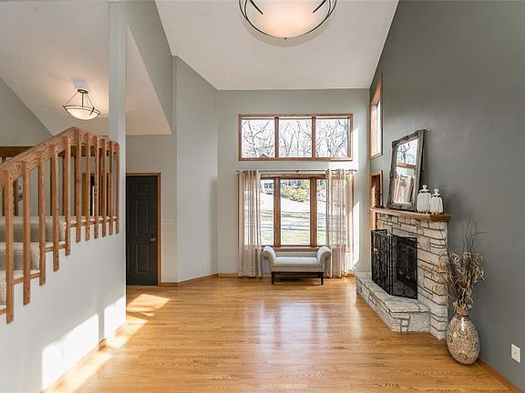 Great NE home in popular neighborhood, sitting on half an acre wooded lot. Drive up and pull into the new driveway with new retaining wall along the side. Walk in the home and be taken back by the tall vaulted ceiling and stone wood burning fireplace. This home features solid hardwood floors throughout the main level, granite counters in the kitchen, main floor laundry, a formal dining room, great room, half bath and living room with screened in porch just off of it. Upstairs you'll find 3 nice sized bedrooms and 2 full baths. The master is spacious with his/ her sinks, walk-in closet, his/her sinks, and tiled shower. The walk-out lower level has a wet bar, a gas fireplace, another bedroom/ bath, nice storage and a rec room that is perfect to watch the games. Walk out back and enjoy the deck/patio and privacy of the wooded backyard. Move in ready, all appliances stay, even washer/dryer.