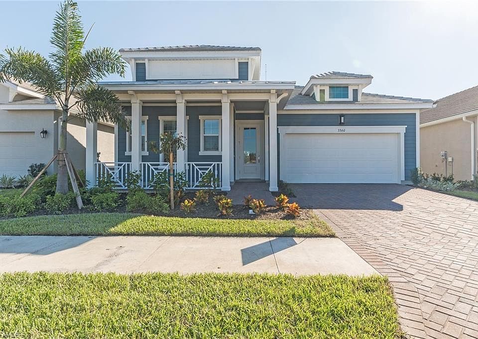 Living is easy in this generously spacious BRAND NEW single family home. This much desired single story Banyan model features an open floor plan that encompasses 3 spacious bedrooms, 2 -1/2 baths, a study, and a 2 car garage. The expansive living room opens up to a spacious screened lanai, oversized yard and plenty of room for a pool; a stylish kitchen with 42 inch cabinets, stainless steel appliances, Granite countertops, and a butler's pantry; tiles in the living area, spacious owner's suite with a walk in closet; owner's bath with dual sinks, Granite counter tops, walk-in shower. Every detail was carefully selected and quality crafted by a designer. Compass Landing is a private and secluded gated community featuring DEEP LOTS from 50ft.-60ft. wide and 130ft.-180ft. long with low association fees! Located in North Naples and minutes to I-75, Mercato, Waterside Shops, Gulf Beaches and zoned with "A" rated Collier County public schools. Residents enjoy a 2,600-sqft amenity center appointed with resort-style pool, clubhouse, tot lot and fitness center. *Note: Photos are not of the actual home, but of a model with similar floor plan.