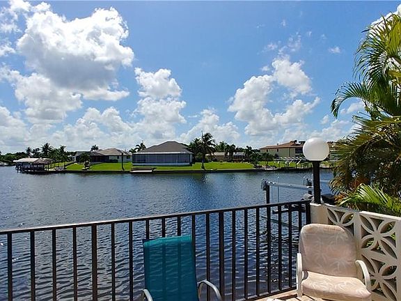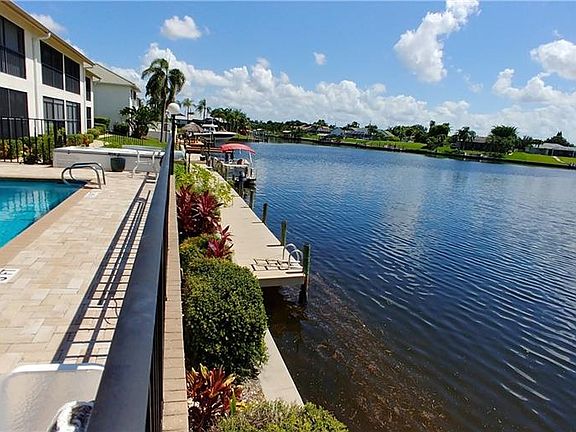 Tastefully remodeled first floor condominium with a gorgeous view of intersecting canals including the Rubicon. NOT a special hazard flood zone! Custom cabinetry and granite counters throughout the kitchen and bathrooms. Special detail's include tray ceilings, customized crown molding, light filtering window treatments, stereo throughout the home and lanai plus beautiful Travertine tile floors. All furnishings will be included except for a few personal pieces. This property has easy access to Cape Coral Pkwy or Veterans Memorial Pkwy and is close to the best in dining, shops, malls and beaches. The community pool area is a short walk off of the 25' by 10' covered screened lanai and like having your own private pool. Covered parking space is included with this condominium. The Community Boat Dock is available to the residents as needed for docking or Gulf access boating and fishing.