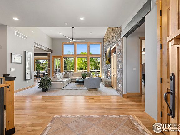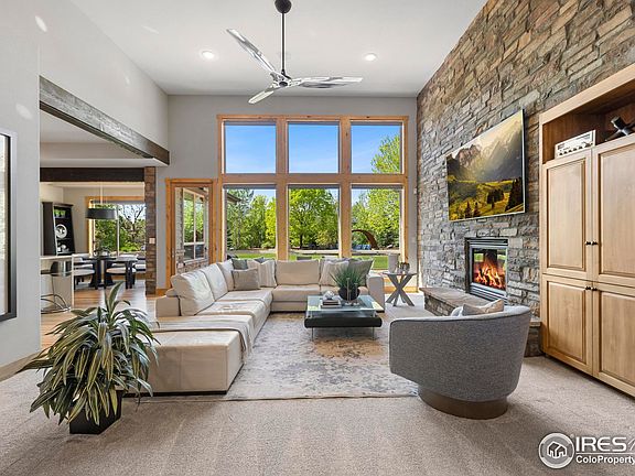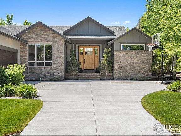 Welcome to this stunning 5-bedroom Colorado-contemporary ranch home, perfectly situated on a spacious 0.54-acre estate lot in the heart of the highly sought-after Fossil Lake Ranch community. This expansive residence offers the best of luxury living, featuring an in-ground heated plunge pool, a 994 sq. ft. drive-through showcase garage, and a newly poured concrete driveway. Inside, you'll find exquisite details throughout, including refinished wood floors, upgraded light fixtures, a large quartz kitchen island and work station sink, three cozy fireplaces, and Bosch stainless steel kitchen appliances. The open-concept layout includes a gourmet kitchen with a dining nook that seats 12, a spacious great room with a dramatic stone wall, and expansive windows with new glass offering endless views of the backyard sanctuary. The main level features two primary suites, a dedicated home office with a private exterior entrance, and incredible natural light throughout. The finished basement offers three additional bedrooms (one currently used as a home gym), a large recreation room, a wet bar, and generous unfinished storage space. Step outside to discover a beautifully landscaped yard with over 750 sq ft of patio space, and plenty of space for entertaining under the Colorado sky. Located within walking distance to Zach Elementary, Preston and Kinard Middle Schools, and Fossil Ridge High School, and just minutes from the Harmony Corridor, top employers, medical centers, and I-25-this timeless home truly has it all!
