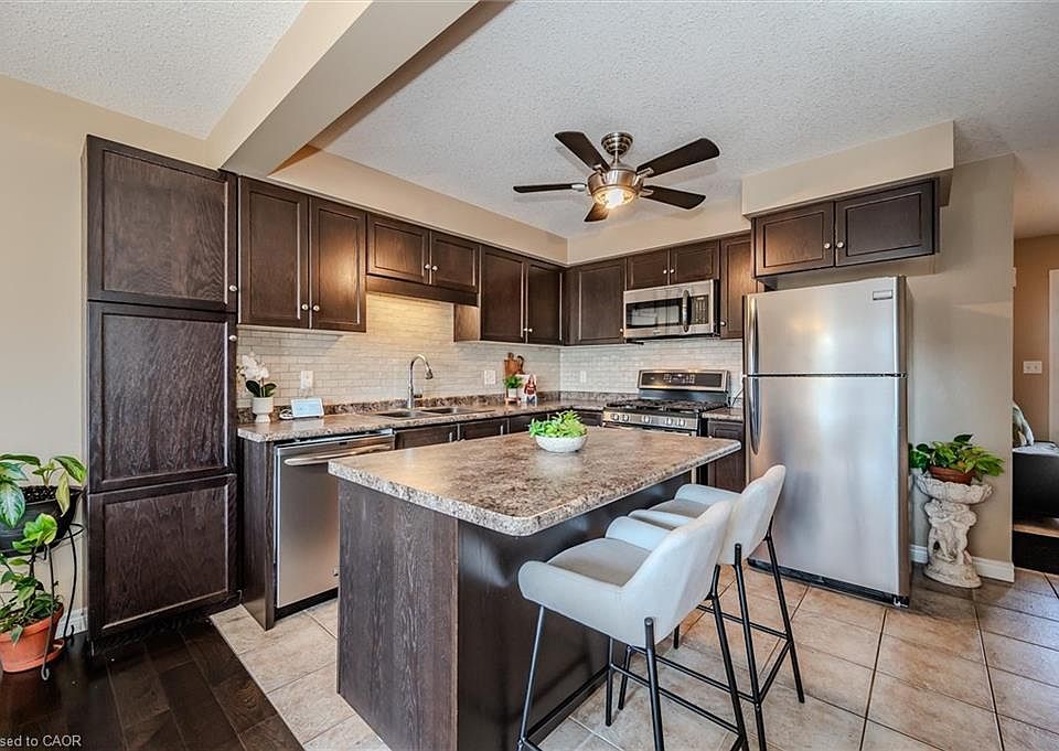 Immaculate 3-bedroom, 4-bathroom townhome in Guelph's sought-after South End! Step inside from the covered porch into a spacious foyer with a double coat closet. The open-concept main level features a stylish kitchen with stainless steel appliances, a chic backsplash, and a central island with breakfast bar, perfect for everyday meals and entertaining. The living and dining area flows seamlessly to a private deck, ideal for summer BBQs. A convenient powder room completes the main floor.Upstairs, the primary suite offers a walk-in closet and its own private ensuite. Two additional bedrooms share a well-appointed 4-piece bathroom. The professionally finished basement adds valuable living space with wide plank flooring, pot lights, an egress window, and a third full bathroom, ideal as a rec room, home office, gym, or even a fourth bedroom.Located just steps from public transit, Arkell Crossing, and Starkey Hills scenic trails, with quick access to the University and the 401, this home is a fantastic option for professionals, families, or investors alike.