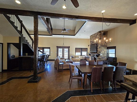 One of a kind! This uniquely built pole barn style home sits on over 10 acres of land on the outskirts of Carbondale. This hone features 5 bedrooms, 2 full baths, and one with a jet tub. Very large great room with cathedral ceiling, unique wood columns, stone fireplace, and bar. The abundance of natural lighting fills the great room which has easy access entrances to the decks and patios over looking the estate. Upstairs features master suite with private deck. Extra kitchen area and living area with additional bedrooms. This area also has another direct access to the 3 car garage. Office has an exterior door to carport with easy access to an additional 3 car garage and workshop. Level and slopping grounds include a large, well stocked pond, water fowl, and small dock for fishing. Additional building sites are available on the property. Only 5 minutes to town, but you wouldn't know it from this serene setting.