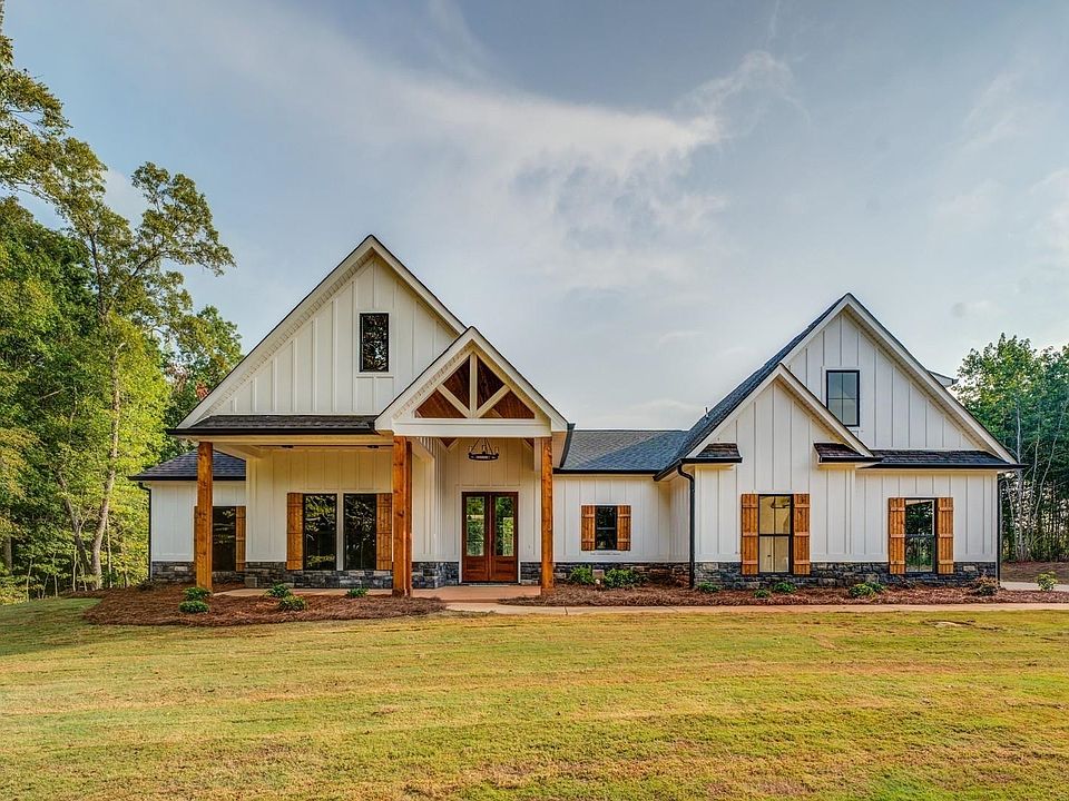 5 bedroom/3.5 bathroom Country Farmhouse plan on a private 3 acre lot. The home has masonry board and baton siding with wood accents in the front. Inside the open floorplan offers a kitchen with granite countertops and an island which has a stainless farmhouse sink. You will love the large walk in pantry. The living area has a stone fireplace with a timber mantel. The master bathroom has a separate vanity space, separate tile shower and garden tub with a large walk in closet with access to the laundry room from the master closet. The other 3 bedrooms on the main floor shares a hall bath with a double vanity. The 5th bedroom with private bath is upstairs. Drop bench in the mudroom. The front porch will have tongue and grove ceilings. The back porch is covered with a TV outlet offering a perfect place for entertaining. The 2 car garage is side entry with room for storage.