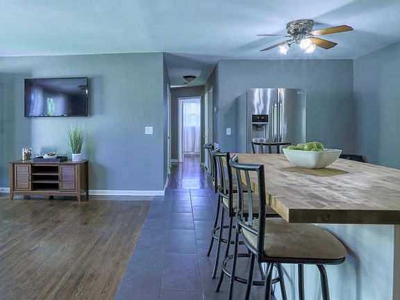 One Story Home - Lots to Offer! Open Floor Plan, Hardwood Floors, Freshly Painted, Bonus w/Exterior Door and attached bath/utility room. Kitchen has Stainless Steel Appliances & Large Island w/Butcher Block Top and Seating. Backyard is perfect for Summer BBQ;s with lots of shade and even a Creek! Large Deck for grilling and Firepit for Smores! Flood Insurance is required (Seller currently pays less than $90 a month) Seller related to Listing Agent - Refrigerator Negotiable-Curtains don't stay