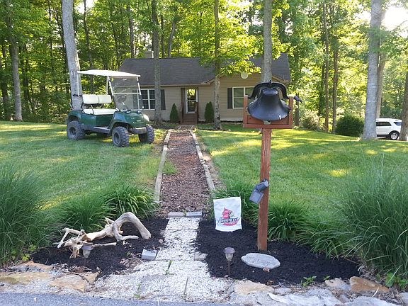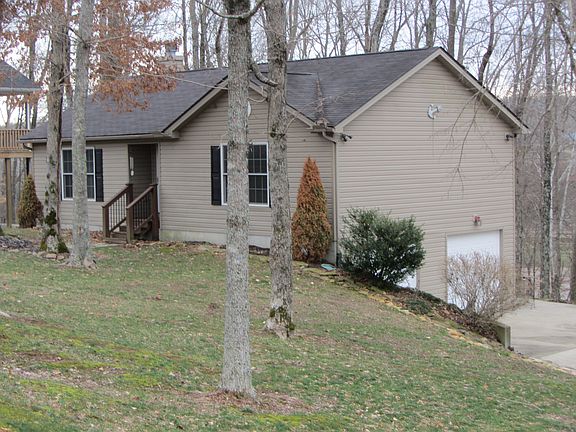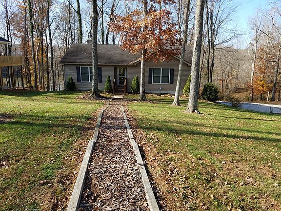Beautiful Rough River lake front property with 3 bedrooms and 2 full baths on gentle sloping lot with docks in full view of the house on Rough River Lake. The property is in the very desirable Deed restricted Holiday Rough sub-division which requires minimum size homes and no trailers of any type. House is a fallaway ranch; on the first level are 2 bedrooms, full bath, kitchen (with range, refrigerator, built-in microwave, and dishwasher), dining area, laundry room (space for washer and dryer and has electric water heater and electric heat with central air-conditioning) and family room. The upper level has 3 walk-in closets, a pantry and a linen closet. Fall-away level has a bedroom and full bath and two car garage with electric door openers. Both levels have sliding glass doors to porches with great lake views. House has approximately 1516 sq. ft. (1128 upstairs and 388 on fallaway level) of living space plus 25 1/2 foot by 27-foot garage on lower level. This property includes two lots; the lake side lot with the house is 101 feet of lake frontage by 310 + distance to the road with 5 blacktopped parking spaces at the road. The lot across the street is partially wooded and partially cleared and is 101 feet by 210 feet – total property for both lots is approximately 1.2 acres. One dock included with Army Corp of Engineers approval.