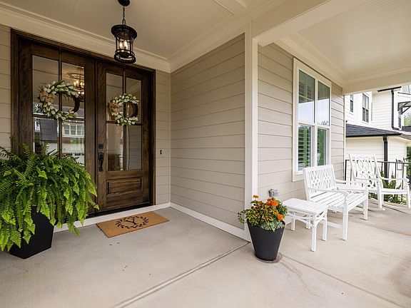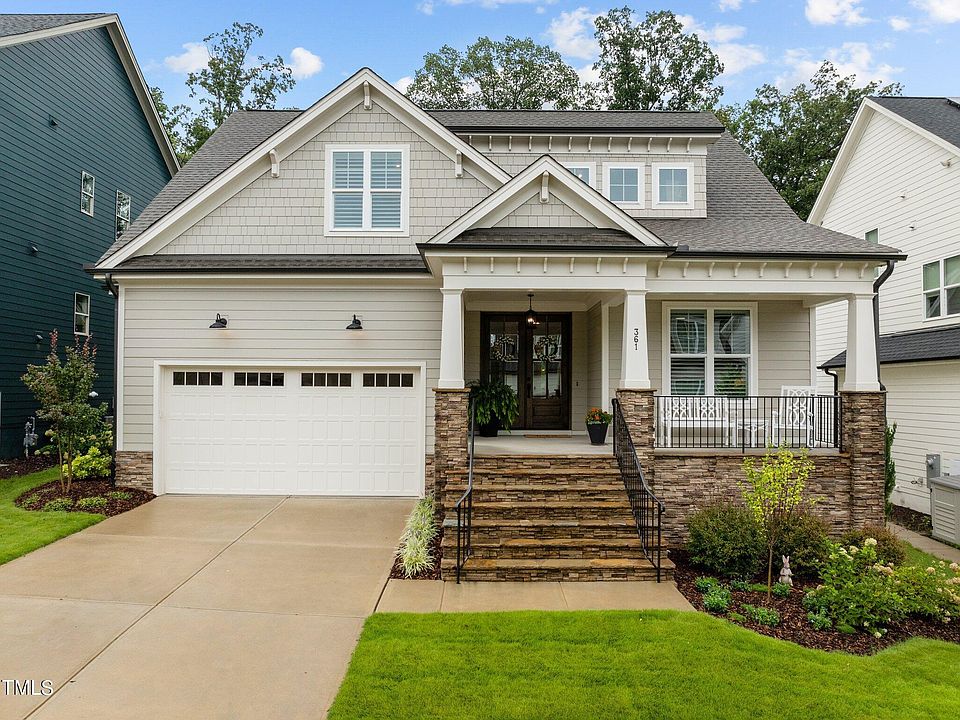 Step into luxury with this exquisite green-certified ''Concord'' Homes by Dickerson build boasting main floor living and custom touches throughout. Nestled on a beautiful lot that backs up to the woods in Briar Chapel near the end of a cul-de-sac street, this home combines elegance and modern convenience. The main level features a spacious office perfect for working from home, an inviting guest bedroom, and a luxurious owner's suite with a large shower and walk-in closet connected to the laundry room. The upper level offers an additional guest bedroom, an expansive bonus rec room with a custom wet bar, and two generously-sized walk-in storage areas. Upgraded features include site-finished hardwoods, a tankless hot water system, custom built-ins in living room and drop zone, an upgraded trim package, and a sealed crawl space. Enjoy outdoor living with an enlarged screened porch featuring a cozy gas fireplace and a Trex deck installed in 2022. The beautifully landscaped yard has brand new zoysia sod in the front yard. Additional highlights include a stone front with fiber cement siding, 55 SEER rating, dual zone HVAC system with gas furnaces, extensive landscaping, a 4 ft extension to the screened porch, a 5 ft tall encapsulated crawl space, easy access under porch storage, a polyurea garage floor coating with a lifetime warranty, custom interior shutters and window treatments, upgraded marble countertops in the kitchen and primary bath, upgraded baths and fixtures throughout, and custom trim in the office with pocket doors. This home represents the perfect blend of functionality, luxury, and sustainability. As part of the vibrant Briar Chapel community, you'll have access to amenities like two pools, a clubhouse, a large sports complex, walking trails, a fitness center, and a dog park.