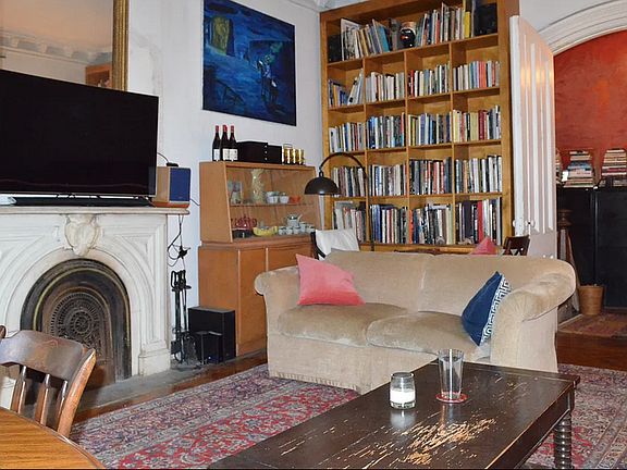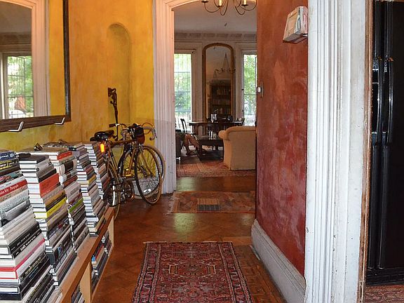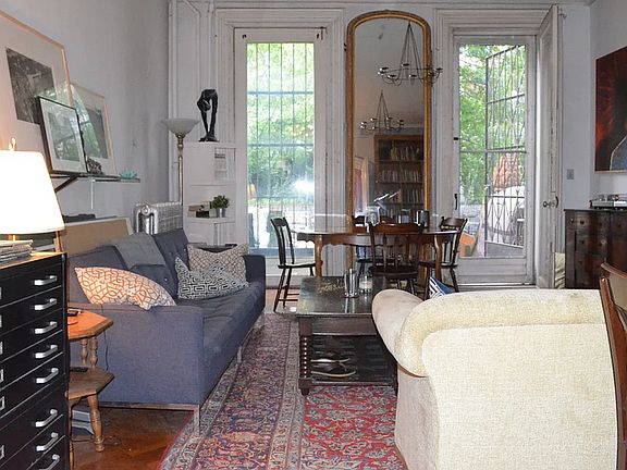 NOW Off The Market, Pending Lease signing. Unique space and arrangement; huge apartment (long term sublet & it is partially furnished) with private outdoor deck, 11'+ ceiling high, massive dining/ living room w/deco WBFL, EIK on parlor floor and two oversize king size bedrooms with full bath w/WD on 2nd floor. Top floor w/huge 3rd room reserved as working studio/storage for the owner. This one of a kind house has original moldings, hardwood floors, crown moldings and ceiling medallions, expo brick wall and fire place mantel. Too much details, best to view photos then in person. Small pets upon approval. Available to be see by advanced appointment only (first come- first served) and Open House by appointment only. Broker's fee will apply. Prospective tenants please email for appointment and /or more info. Now PENDING