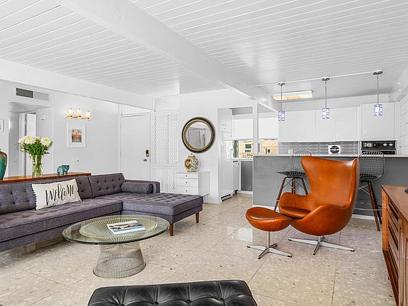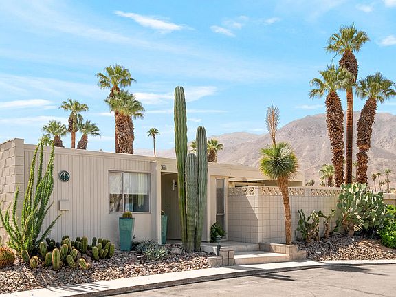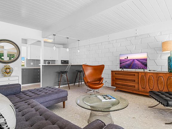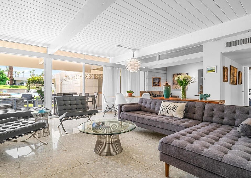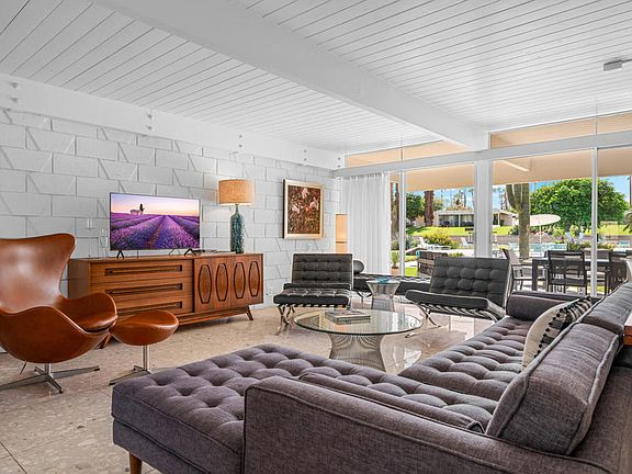 Live your mid-century dream! 2 BR / 2 BA condo @ 1,173 sq. feet located in Sandpiper in Palm Desert. This is one of the original condos designed by Wm. Krisel and built in 1960 with a historical designation and part of the Mills Act program (allowing for reduced property taxes). The condo has all of the original architectural features intact: exposed concrete block walls, clerestory windows, tongue & groove ceilings and a bedroom accordion wall allowing for one huge great room or a flexible guest bedroom. The open floor plan features gorgeous terrazzo tiling throughout along with an updated kitchen complete with original cabinets in pristine condition and quartz countertops. The primary bedroom suite has an en-suite bathroom, laundry closet and access to a private patio, while the second bathroom offers an expanded storage area. The poolside patio offers a serene area perfect for entertaining under the stars with gorgeous views of the pool area, greenbelt, and southeastern mountain views. Unit includes one designated covered carport space. HOA allows short term rentals of less than 30 days. Located within minutes to the shopping & dining on El Paseo, hiking and so much more! Come and enjoy the good life.