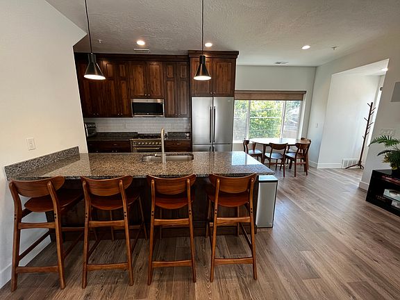 Luxury condominium, 2 bedrooms, 2.5 bath, private two-car garage plus third private parking pad outside, laundry, all high-end appliances included, home theater ready. Secluded from street. View of capitol and downtown skyline. Less than half mile from I-15 entrance. Peaceful condo away from the street is the private end of four in the quiet Capitol Hill Neighborhood north of downtown. Garage has epoxy granite-look floor, laundry room with gas dryer, tankless water heater and utility sink. Main level has 9-foot ceilings, kitchen with granite countertops, subway tile backsplash, upgraded stainless appliances, including refrigerator, Italian gas convection/air-fry range, microwave, dishwasher. Half bath, wood floor, 72-inch ceiling fan and open living area wired with seven home theater speakers installed in walls and ceiling. Upper level master bedroom has bathroom with heavy sliding barn door glass, and walk-in closet. Second bedroom has murphy bed installed, and another full bathroom. Both bedrooms with ceiling fans. All hardware from specialty suppliers. 15 double pain vinyl windows. Tweed fabric roller shades. Granite and soft close upgrade cabinets and vanities throughout. Over-spec A/C. Structured media panel, with Cat 6 and coax to every living space. Security camera system. Convenient access to I-15 at 600 North, close to downtown. HOA fee included in rent. Construction completed Oct 2021. Willing to lease furnished as Corporate Apartment (with adjustments to terms). You pay no HOA fees - they are included in rent. You only pay electricity, gas and internet / cable.