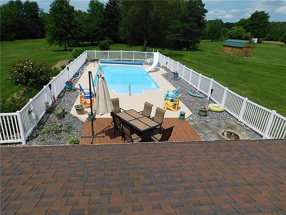 Just imagine relaxing by your fenced-in pool w/family & friends enjoying the summer sun or sitting under the covered patio w/drinks of merriment reading or relaxing. Nicely updated oak kitchen w/granite counters, recess lighting & tile floor. Private first floor master en suite wing w/large bath including standing shower & jacuzzi tub, double doors that exit to patio/pool area. Over-sized LR w/stone Gas FP. DR for holiday & evening meals. 4 additional BR's on 2nd floor. In total, 3 full bathrooms & 1st floor laundry simplify your life. 3.64 Acres & perennials of all colors for personal enjoyment. Tons of storage space and closets abound. Note: little extras like curly maple mantel on fireplace, firepit by pool area & dual sinks in master bath as well as water softener. The additional land offers four wheeler fun space as well.
