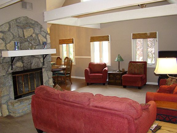 Open floor plan, stone fireplace,