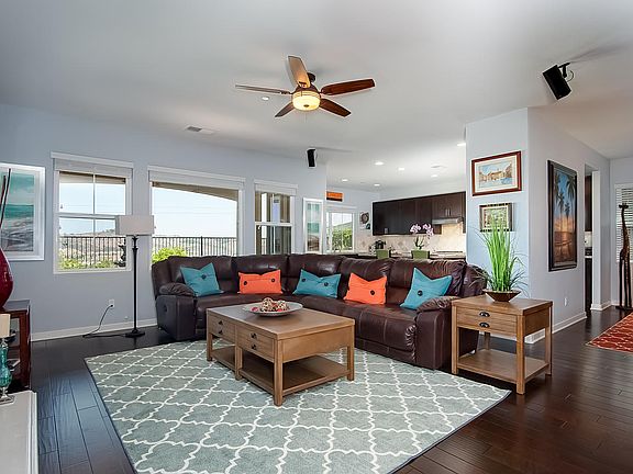 Stunning views of the ocean, lagoon and mountains! Private setting with no homes behind or to the west. Open concept living with beautiful wood floors. Entertain guests in the spacious kitchen with large island that seamlessly flows into the great room. Backyard includes built-in BBQ, bar, covered patio and grass area. Sunset and ocean views from large master balcony and back yard. Ideal floor plan with bed/bath downstairs and upstairs bonus room.
