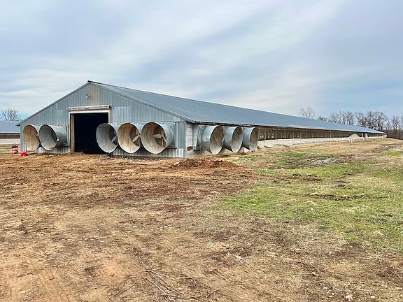 This outstanding ROI turkey production farm has the added bonus of a beautiful custom home and Class 2 and Class 3 tillable soils. The owners are currently under contract with Cargill. The barns are set up to achieve an Avian-free certification, which can translate to an additional $10,000 per flock. Please note: new owners will be required to earn the above-stated certification. The current yearly income on 2.2 flocks is $129,000.00, which does not include the additional Avian free status bonus. Additional income is supplemented by the sale of the litter. The custom six bedroom, four bath home, built in 2020, is approximately 4,600 finished square feet, with 2600 on the ground level and 2300 on the walk-out basement level. Craftsmanship abounds throughout, from the live cedar posts on the porch and interior ceiling beams to the custom hickory cabinets in the kitchen and bathrooms. The main level includes a spacious open-concept living/dining/kitchen area, a large pantry, a primary bedroom with a full bath, a second bedroom, a second full bathroom, an office and a utility room. The finished basement includes a large family room, mini-kitchen work area, 4 bedrooms, and 2 full baths. The 2-car garage is attached. The water heater and cook stove are electric. The furnace is a dual-system heat pump with propane override. A gas valve hook-up for a grill is located on the front exterior wall. Basement walls are constructed with highly energy-efficient ICF forms. The open ground is currently utilized for pasture/cattle but is composed of Class 2 and 3 tillable soils, which opens up an avenue to additional income. A 75,000-watt generator powers the property in the event of power outages. Several additional buildings are in place for storage or cattle care. There are approximately 13 acres of timber, which can be hunted, and two ponds. This fantastic property lends itself to multiple avenues of income potential!